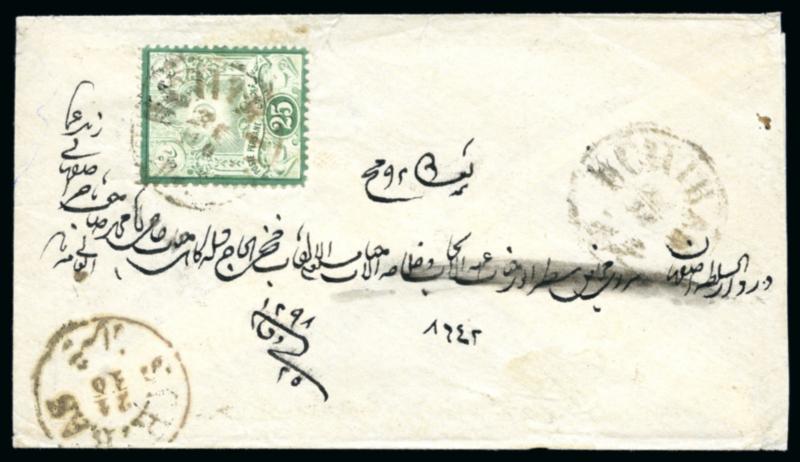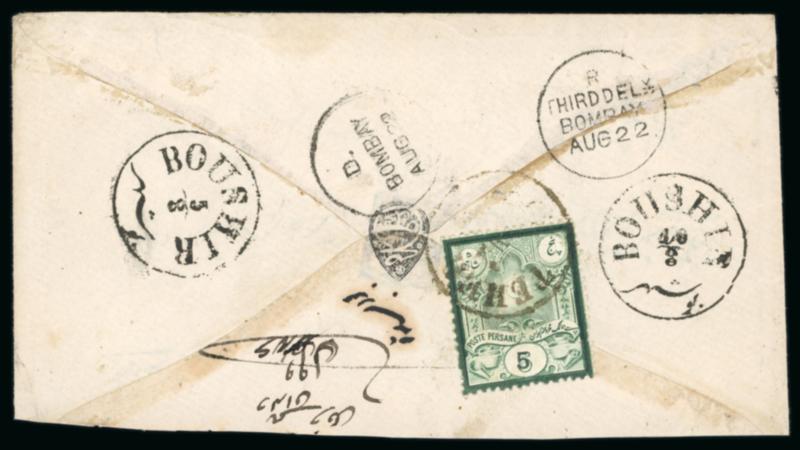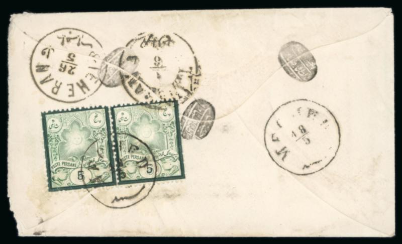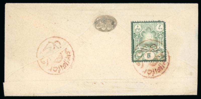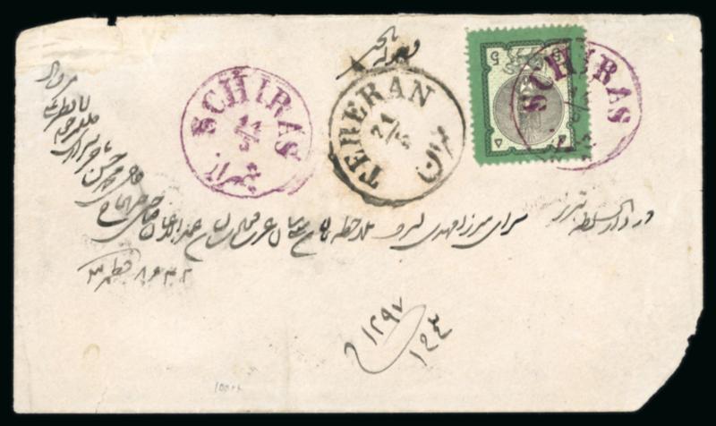 1879 5s green and black on letter to Teheran, struck by purple circular Schiras cds 14.5, with Teheran 21.5 arrival alongside, reverse further Tehran and Tabriz cds, fine. (Image)