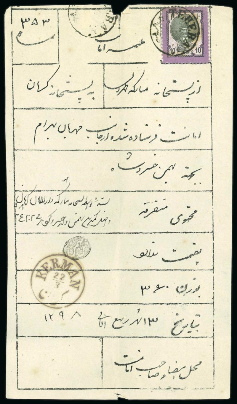 1881 (Mar 15) 10ch purple and black neatly tied to registered parcel receipt from Teheran to Kerman with despatch cds of 6/6 and arrival of 22/3, some folds and small fault at top to left of adhesive (Image)