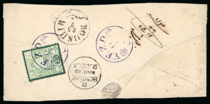 1882 (13 2) envelope to Bombay franked on reverse 5 Chalis 25c green of Mitra issue tied by blue Yezd cds with another strike alongside, Boushir transit (25/2) and arrival cds (Mar 10) (Image)