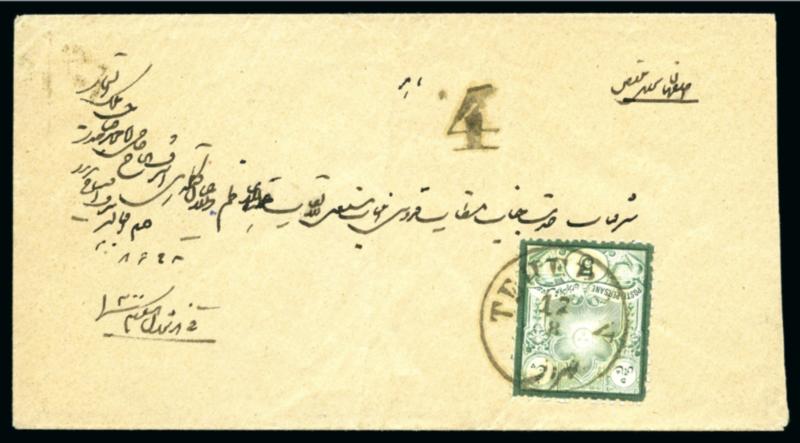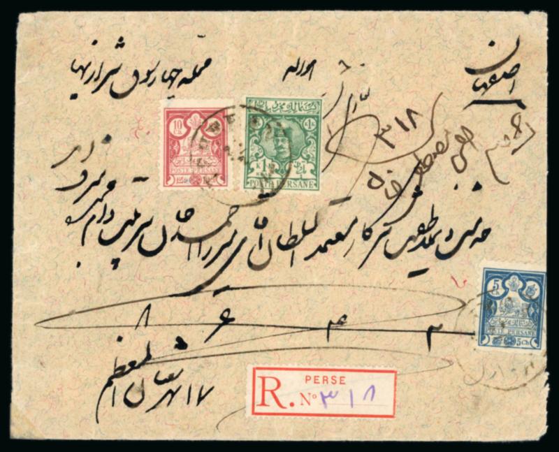 1891 Registered letter sent from Teheran carrying 1891 issue 5ch blue, 10ch rose and 1kr green, all tied by Teheran circular datestamp, attractive Arabic address and reg. label on front; very attractive, envelope with some cropping to right side with some resulting damage to the 5ch stamp. (Image)