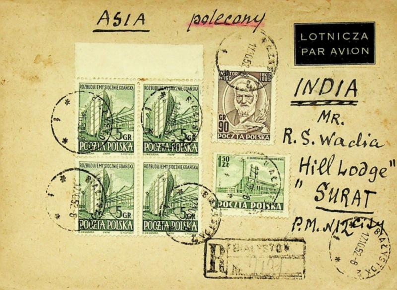 Poland 1952 6v on Airmail regd cover from Bialystok to Surat city India (Image)