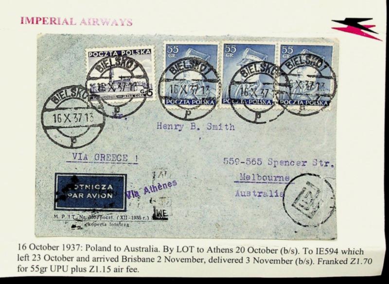 Poland 1937 5gr+ 55grx3 on Imperial Airways airmail cover from Bielsko via Athens Greece to Melbourne Australia (Image)