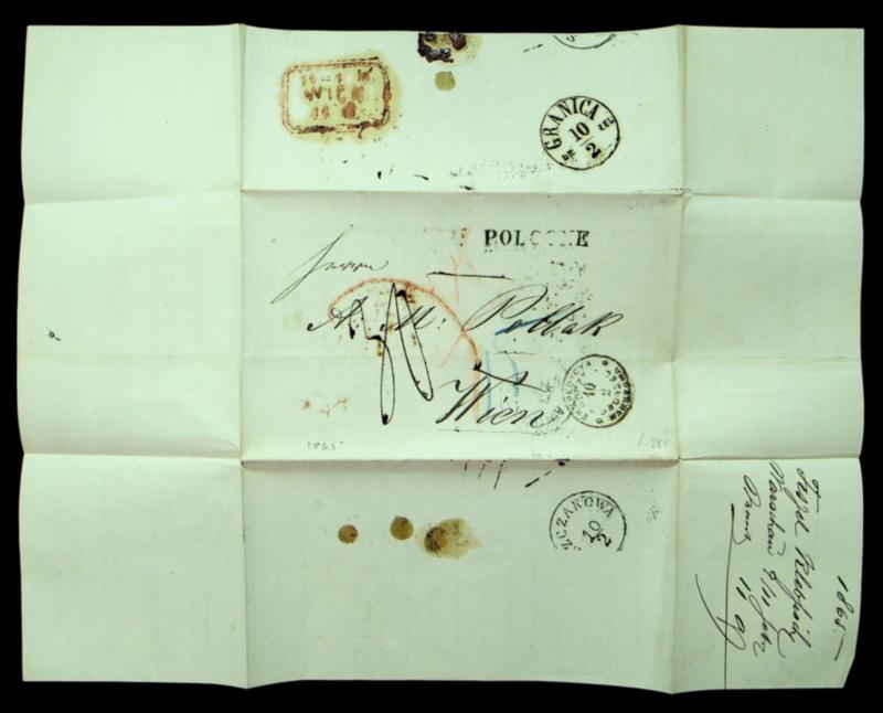 Poland 1865 stampless cover with charge markings from Warschau to Wien Austria w/ transit cds (Image)