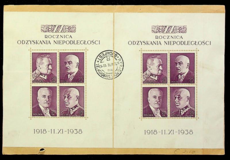 Poland 1938 Anniversary of Regaining Independence 4v, 2 MS w/ Hungary "Budapest" cancel on card (Image)
