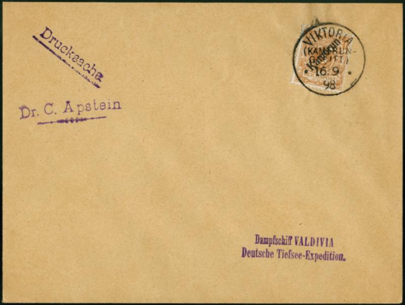 Deutsche Tiefsee-Expedition Valdivia: 1898/99, 3 Pfg. mit Stempel "VIKTORIA 16.6.98” auf Drucksache mit Absenderstempel ”Dr. C. Apstein", der Zoolge der Expedition, adressiert an "Dampfschiff VALDIVIA Deutsche Tiefee Expedition”, tadellos