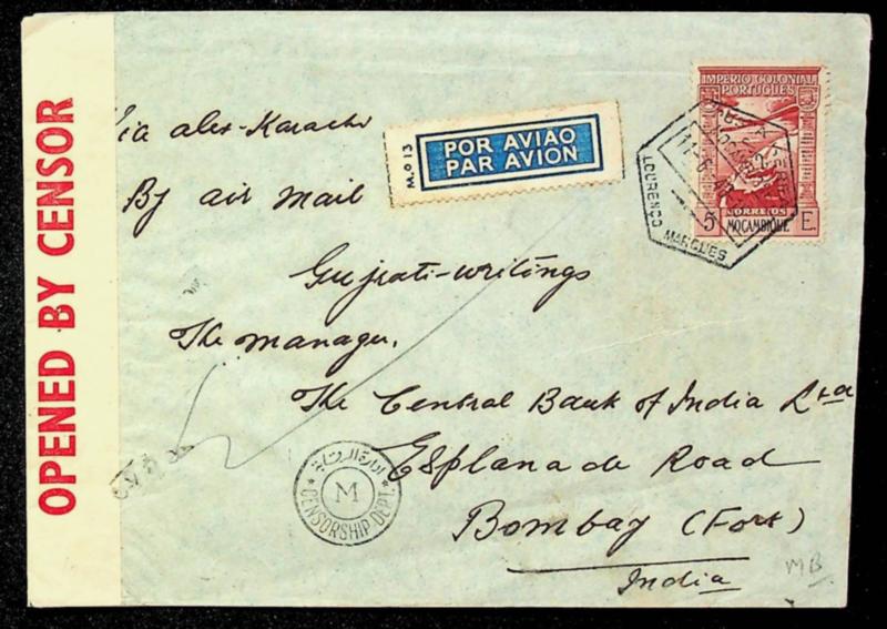Portuguese Mozambique 1940 WWII 5e censored airmail cover from Lourenco Marques via Cairo Egypt/ Karachi to Bombay India (Image)