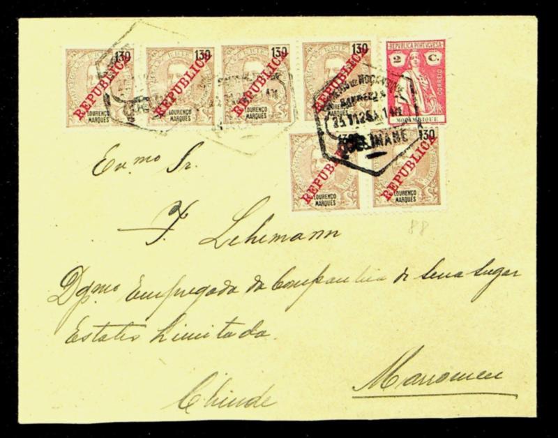 Portuguese Mozambique Lourenco Marques 1925 7v w/ "REPUBLICA" ovpt on cover from Quelimane to Chinde (Image)