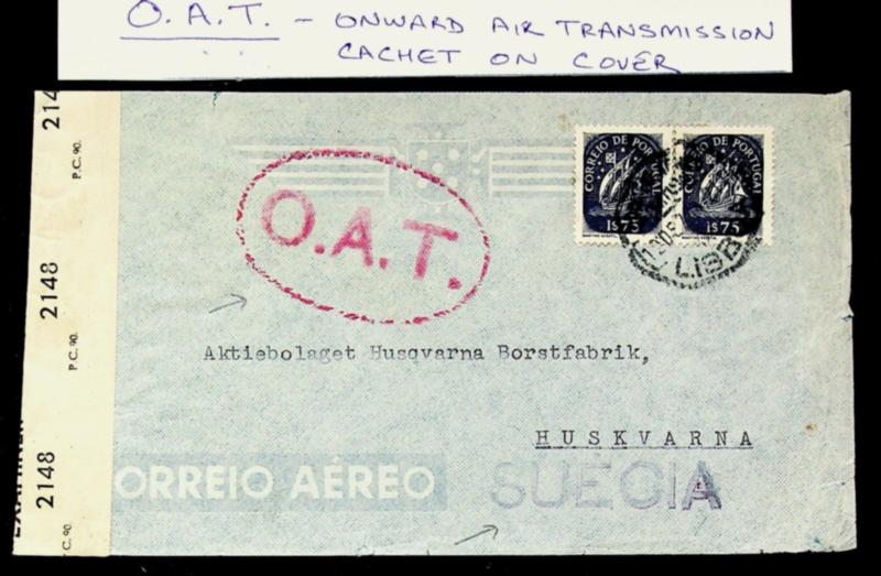 Portugal WWII 1.75e pair on censored airmail cover w/ oval "OAT" cachet in red from Lisbon to Huskvarna Sweden (Image)