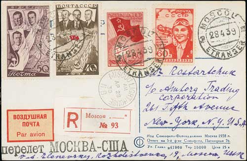 1939 (Apr 28) Moscow to New York non-stop flight, forced to descend in New Brunswick, registered picture postcard (Lenin's tomb and Kremlin) with four stamps totalling 230k, Moscow and "MISCOU LIGHTHOUSE / N.B" datestamps, straight line flight cachet. Fine and scarce, 32 postcards flown. Photo on Page 212. (Image1)