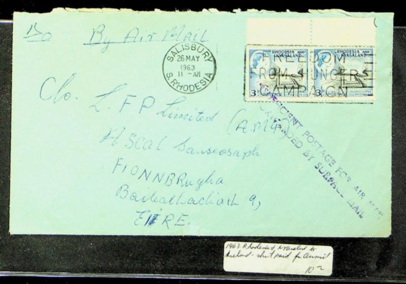 Rhodesia & Nyasaland Salisbury 1963 3d pair cover w/ "insufficient postage for airmail forwarded by surface mail" cachet to Ireland (Image)