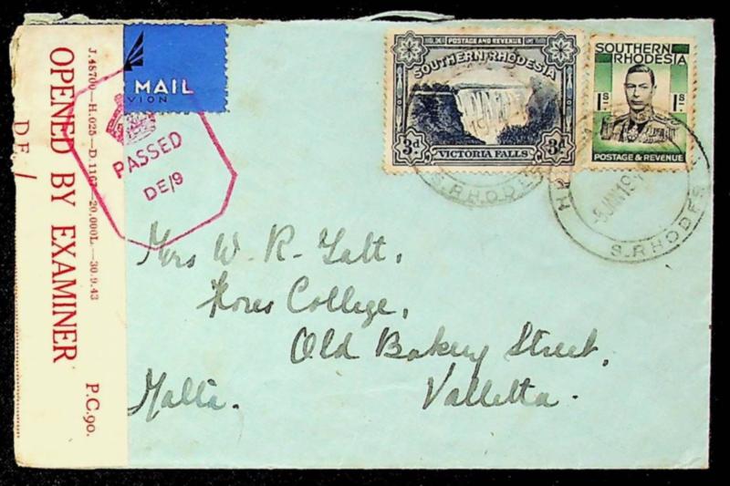 Southern Rhodesia 1944 WWII 2v censored airmail cover via Beira Mozambique/ Cairo Egypt to Valletta Malta (Image)