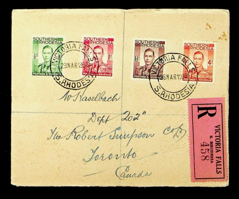 Southern Rhodesia 1938 KGVI 4v on Regd cover from Victoria Falls to Toronto Canada (Image)