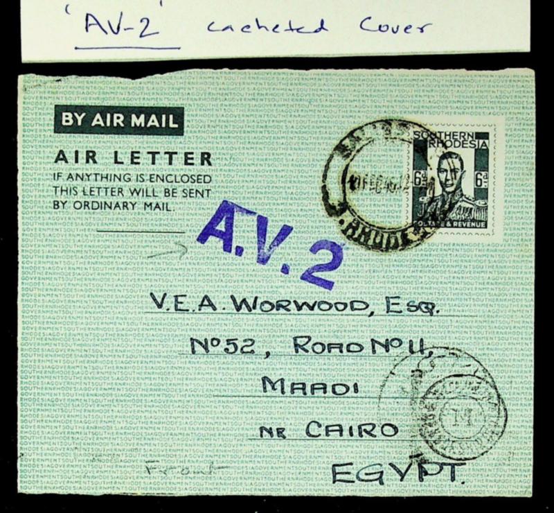 Southern Rhodesia 1945 WWII KGVI 6d censored Air Letter front w/ "A.V.2" cachet in indigo from Salisbury to Cairo Egypt (Image)
