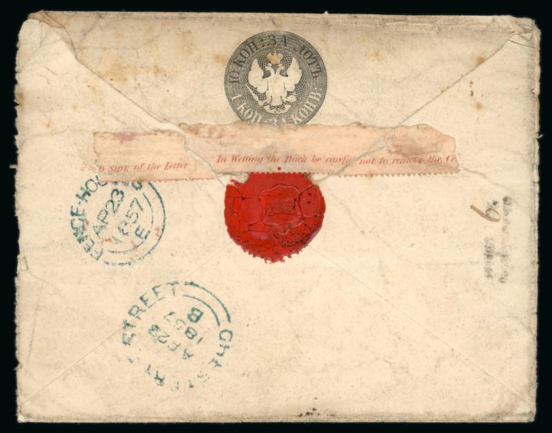 1857 Russian stamped envelope 1848 10 (+1) k, sent to Fence Houses, England, endorsed “Paid for England”, with London Paid 23 Apr 1857 and large red circular P; on reverse is Chester-le-Street 23 Apr and Fence Houses 23 Apr arrival, back flap re-sealed by a marginal strip (probably from a UK 1d red) with the inscription “side of the Letter – In wetting the Back be careful not to remove the Ce…”; extremely rare usage of the stamped envelope for international mail, with rough opening to the right side, and some toning to front. (Image)
