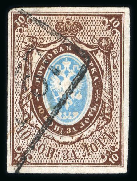 1857 10k brown and light blue, four good even margins cancelled with pen cross and good part pre-stamp cancellation `Belostok/ 8 Feb 58`(now in Poland). Tiny tear in the margin at left. A rare cancellation on first issue. (Image)