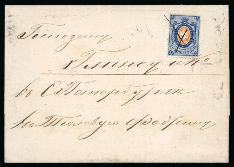 1858 (Feb) double weight outer letter sheet, from Moscow to St Petersburg, bearing single franking 20k dark blue/orange, thin paper tied by pen cross, arrival backstamp. A fine and fresh example showing the rare use of the pen cross on this value (or indeed a 30k) with only a handful recorded, signed Hoffman, BPB Cert (2004) (Image)