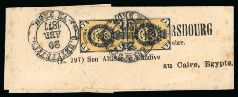 1877 (Aug 20) printed matter wrapper from St. Petersburg, to Cairo, Egypt correctly franked with a vertical pair of 1866 1k black & yellow on horizontally laid paper perf.14.5 tied by "C. PETERBURG VII EKSP. 20 AUG. 1877" cds, Trieste transit (Sept. 1, 1877), addressed to His Highness the Khedivate (of Egypt), a unique destination rarity; certificate Mikulski (1993). (Image)