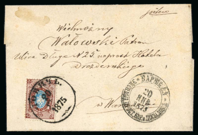 1875 10k brown & blue showing variety deformed "10" at lower left and dot under I bottom right, tied to cover by black circular 20 Jan 1875 cds of Lovich (Poland), Warsaw arrival on the same date. A very attractive small cover with very clear postmarks. (Image)