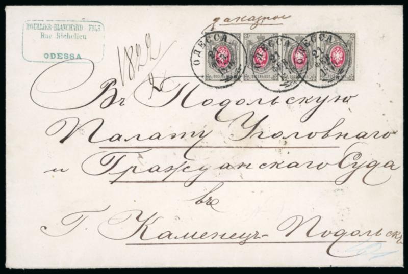 1875 registered cover from Odessa to Kamenels franked by vertical laid paper 1875 8k carmine and grey in horizontal strip of four tied by three neat, clear cds, further despatch and and arrival cancel on reverse. This strip is the largest known multiple on cover, a unique franking of great importance. (Image)