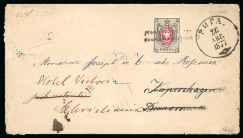 1877 envelope to poste restante, Copenhagen franked horizontally laid paper 8k carmine and grey tied by two-line date stamp. Riga cds alongside, redirected om arrival to Hotel Victoria Christiania, revers with further two-line despatch and Riga cds together with Copenhagen cancel that overstrikes the two-line handstamp, Calves handstamp (Image)