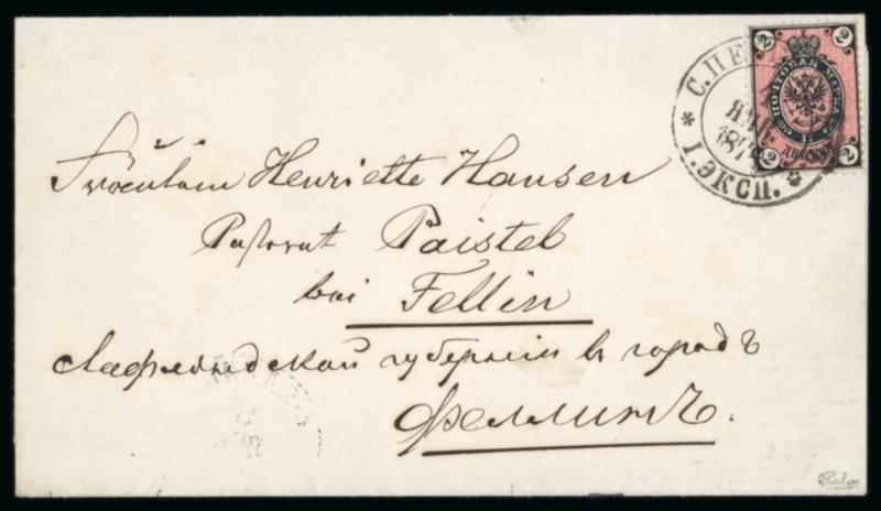 1878 (4 Jan) printed wedding invitation wrapper to Fellin, Estonia bearing single franking 1868-75 2k vertically laid paper tied by clear St Petersburg date stamp, arrival backstamp, fine and attractive. (Image)