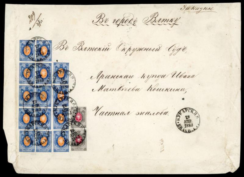1883 (13 Sep) large registered envelope bearing a fine franking consisting of 14 1875 20k (block of 8, vertical stip of four and horizontal pair) plus pair 7k, from Kukarsk to Vjatka, some slight faults to envelope in bottom corners not detracting from this spectacular franking (Image)