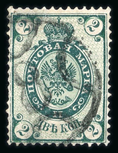 1884 2k russian green with inverted background used with St Petersburg `8`handstamp. a couple of slightly short perfs not detracting from a unique stamp, ex Ferrary (lot 504 at Paris auction). A rare opportunity to own one of the rarest Imperial Russia stamps, Mikulski Cert (2003) (Image)