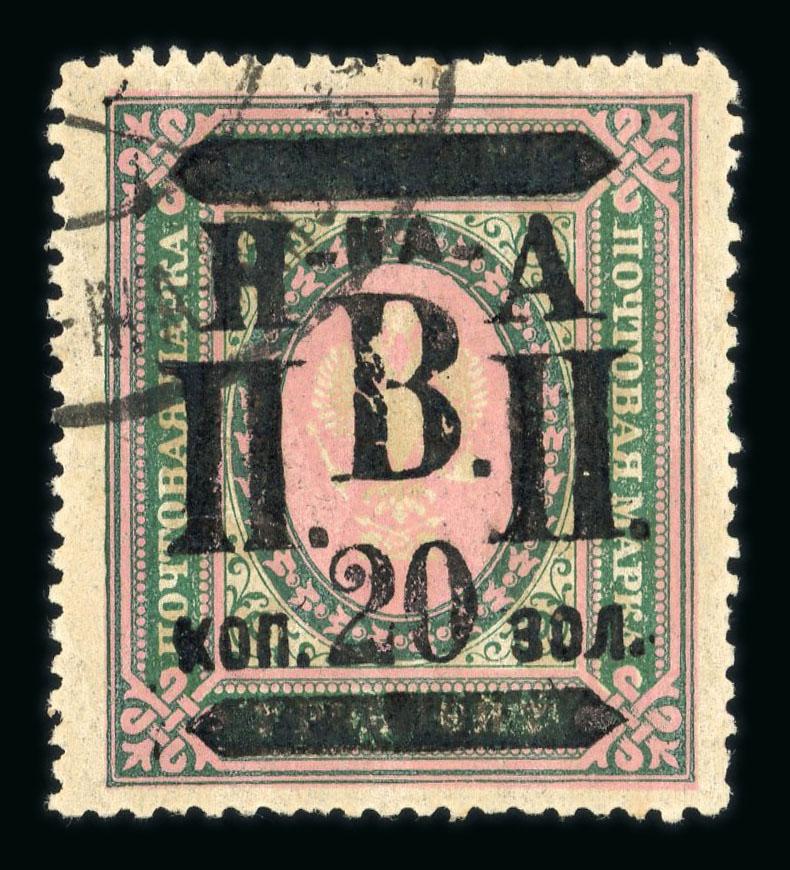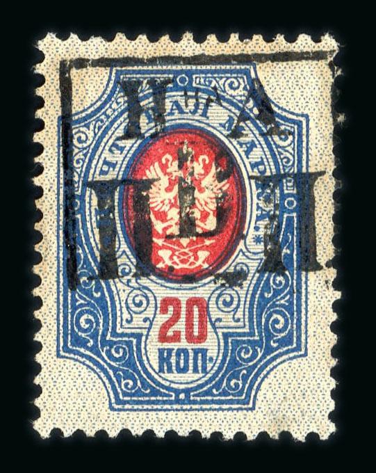 Nikolajewsk 1921 20k blue and red with framed overprint showing partial omission at top, lightly hinged mint with the usual slightly browned gum of this issue; cert. V. Liapine (2008). (Image)