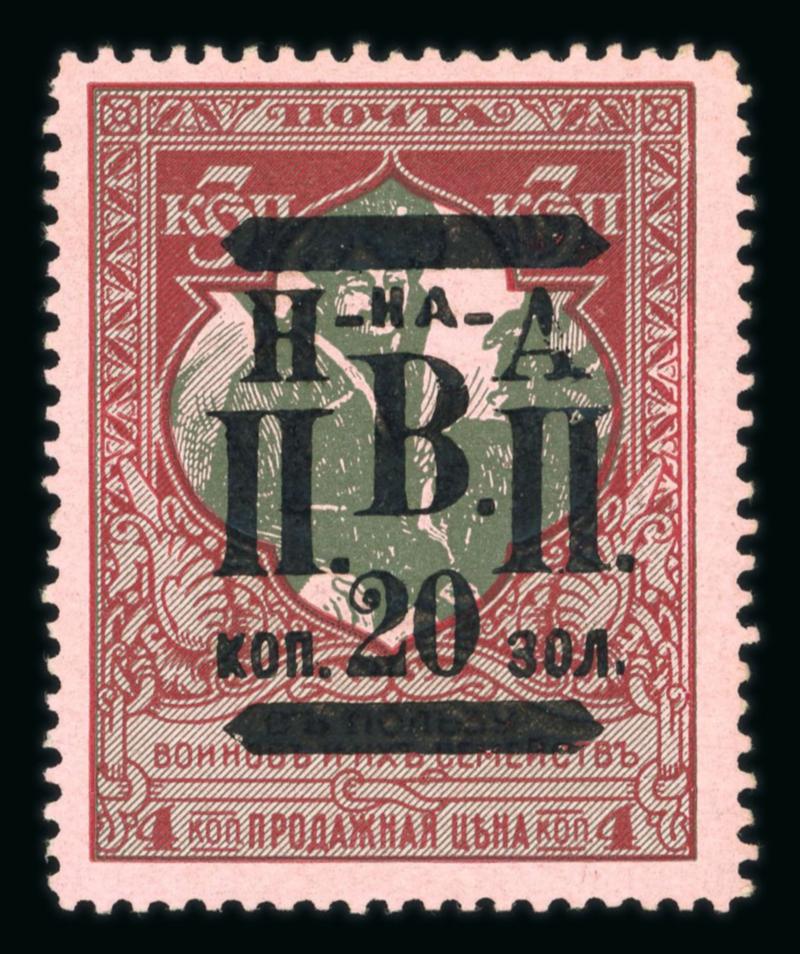 Nikolajewsk 1921 imperf 20k blue and red with framed overprint, four good margins fresh hinged mint; cert. V Liapine (2017). (Image)