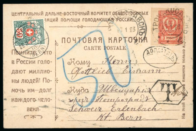 1923 (27.1.) plain card written from the border town of Kyakhta - Troitskosavsk to Bern, Switzerland, the writer mentioning that he has recently left Mongolia because of the weather (-38 degrees), the stamp presumably had been applied before departure as it had no validity from where eventually sent and was subsequently charged enroute at Moscow and a 50c postage due applied on arrival in Bern. An extremely unusual item, maybe a unique occurrence from Mongolia. (Image)