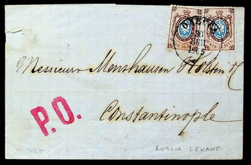 Russia Levant 1865 Coat of Arms 10kx2 on cover w/ "PO" cachet in red from Odessa to Constantinople (Turkey) (Image)