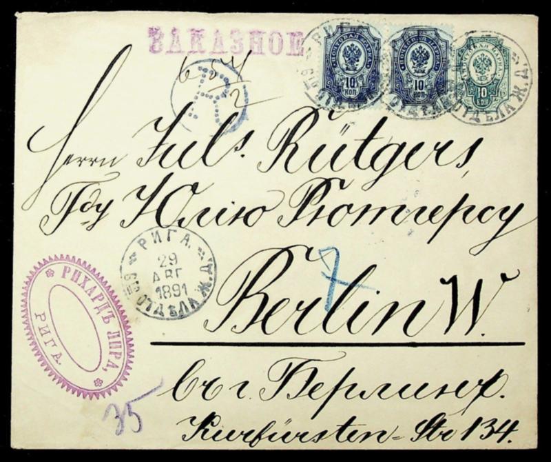 Russia Latvia 1891 Coat of Arms 3v on Regd cover w/ wax seal from Riga to Berlin Germany (Image)