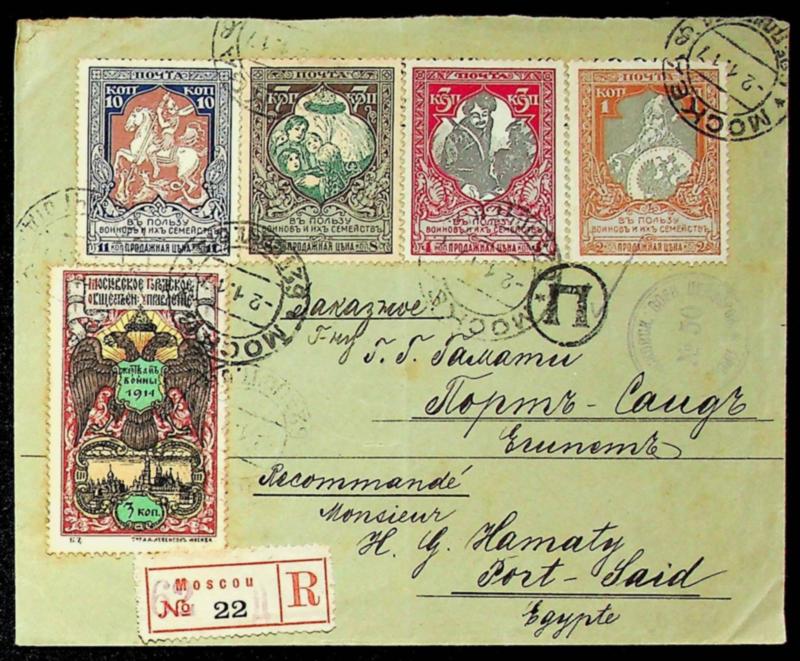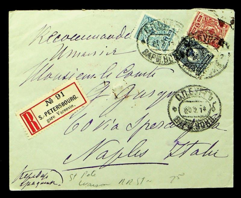 Russia 1914 Coat of Arms 3v on Regd cover from St. Petersbourg to Naples Italy (Image)
