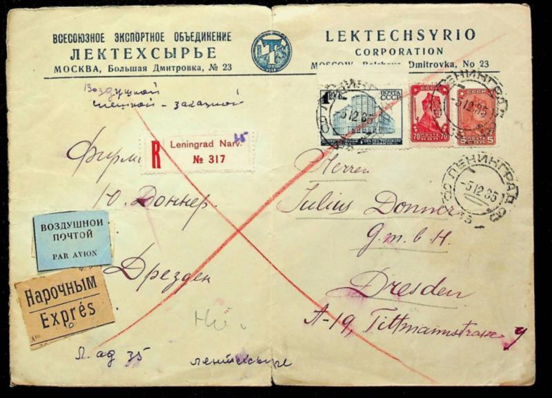 Russia CCCP 1935 3v on Regd Airmail Express cover from Leningrad to Dresden Germany (Image)