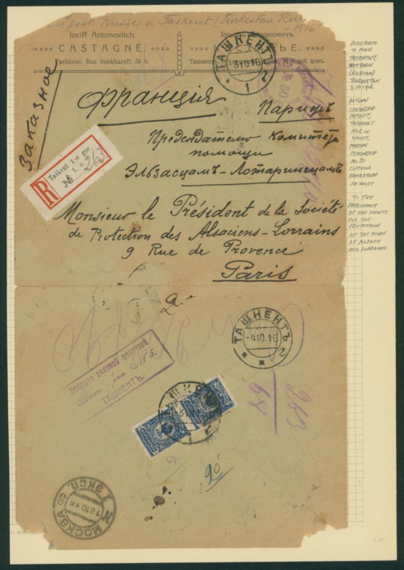 Russia 1909-12 10k pair cancelled by datestamp 1916-10-03 Tashkent to Paris transit :Moscow, 10/13 registered letter sent from Uzbekistan open cover, censored (Image1)