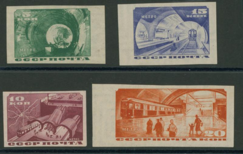 Russia 1935 5k dark green, 10k rose carmine, 15k deep ultramarin, 20k orange, Imperf. Trial color proof 4 examples unused hinged, (Image1)