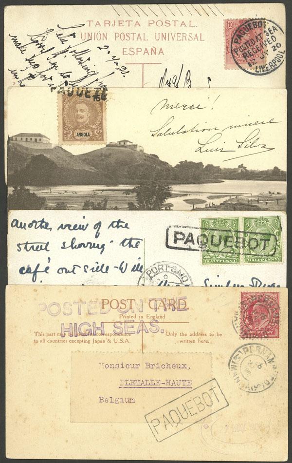 4 Postcards of Las Palmas, Angola, Port Said and Bahia (Brazil) sent between 1904 and 1920 from ships at sea, with varied markings PAQUEBOT, PAQUETE, etc., VF quality!