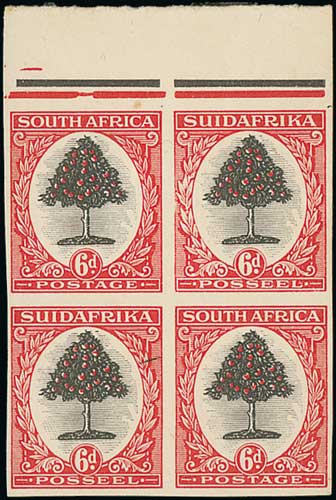 1926 6d, Perf 14½x14 colour trial block of four in black and red on gummed watermarked paper, margin at left, unmounted, scarce. Photo on Page 220. (Image1)