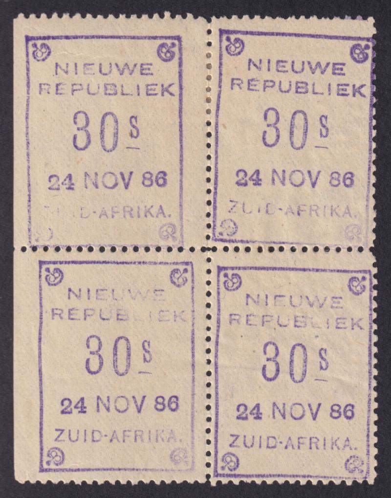 NEW REPUBLIC: Without Arms on Yellow Paper 30/- violet dated '24NOV86' SG 25 marginal block of 4 imperf at left, characteristic minor bends & gum disturbance, Cat £520+, for singles. This block demonstrates the rather haphazard mis-alignment of the handstamped impressions. (Image1)