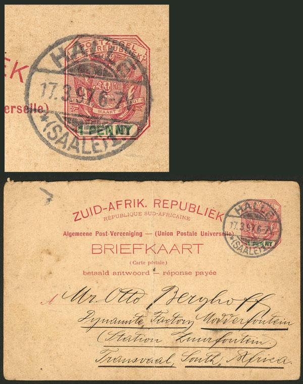 Reply of a double postal card of 1p. sent from HALLE (Germany) to Transvaal on 17/MAR/1897, it has a vertical crease else VF, interesting! (Image)