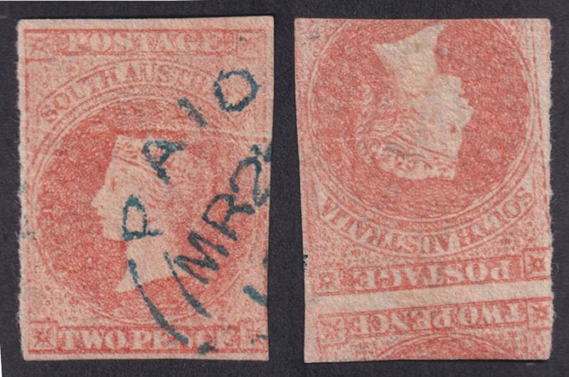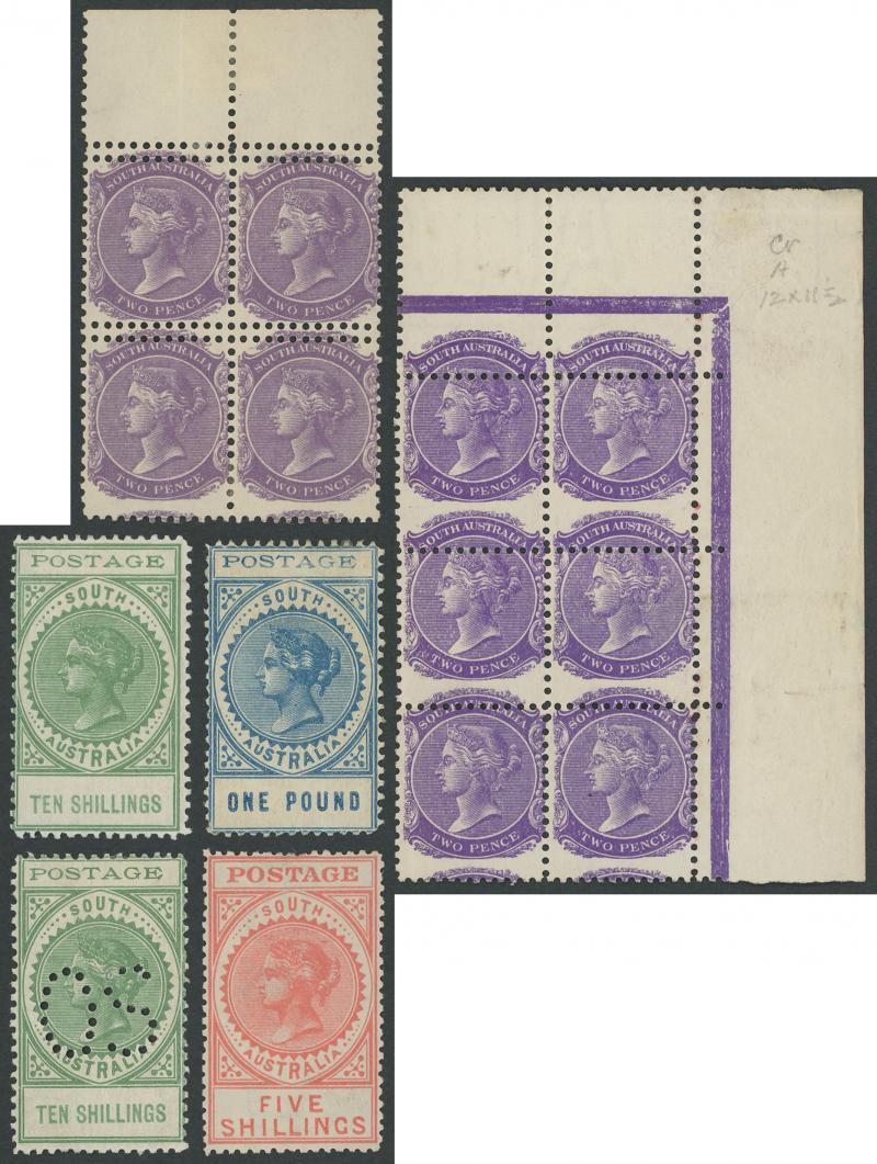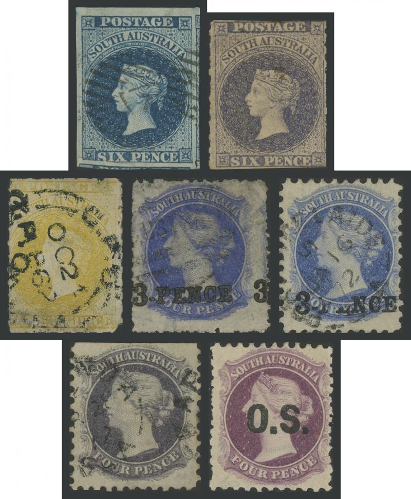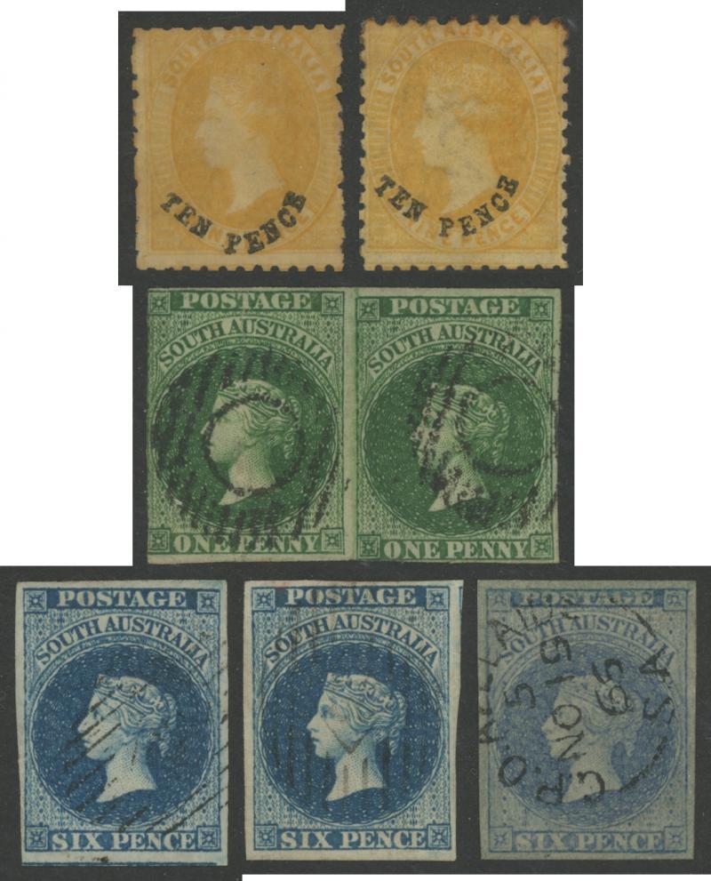 Perkins Bacon range with London Imperfs 2d x6 including one with a Pre-Printing Paper Fold & an attractive strip of 3 and 6d x2 (one a gem with full margins & fragments of adjoining units on three sides), Adelaide Imperfs 2d x4 (one a Major Dry Print variety) & 1/- x2 (one with 1858 GPO cds), First Roulettes with 6d & 1/-, Second Roulettes good range of shades including 1/- yellow-olive from the wreck of the 'Colombo', selections of perforated Large Star & Broad Star issues including '3-PENCE' on 4d in Red x2 & in Black x12 (one with '3-PENCE 3' & one with Defective 'PE'), V/Crown 4d attractive but trimmed perfs at the top, various 'TEN PENCE' on 9d Printings x12, 2/- block of 4, etc, also a small number of unused stamps including a Rouletted 6d and 'O.S.' Perf 10x11½-12½ 4d plum x3, etc, condition variable but many are fine to very fine.