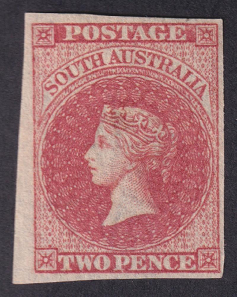 1855 London Printings 2d rose-carmine SG 2, margins close to large, unused, Cat £1500. Alex Rendon Certificate (1986). The stamp has large-part gum but we doubt that it is original. (Image1)