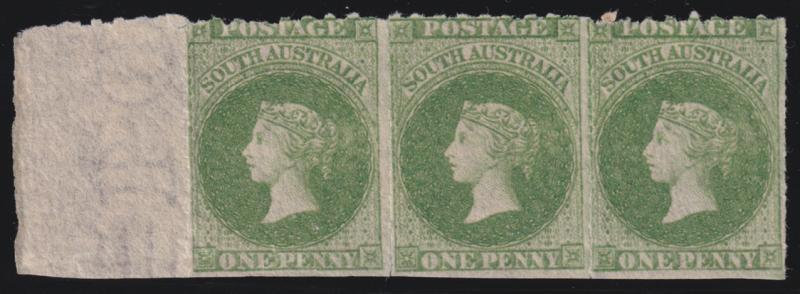 1860-69 Second Rouletted Issue 1d bright yellow-green SG 19 marginal horizontal strip of 3 from the left of the sheet, a little fragile, full unmounted gum, Cat £540+ for unused singles. (Image1)