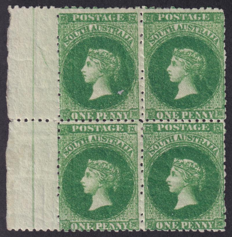 1868-79 Perf 11½-12½ 1d deep green SG 20 marginal block of 4 from the left of the sheet, minor natural gum-bends that in no way detract from the marvellous facial appearance, large-part gum, Cat £800+ for unused singles. Ex 'Dubois' (Part I): sold for SFr610. (Image1)