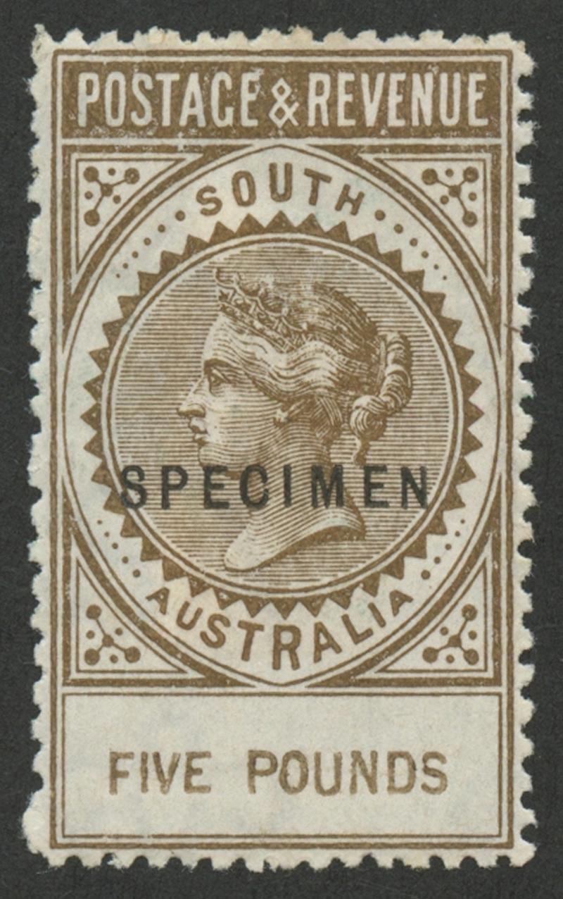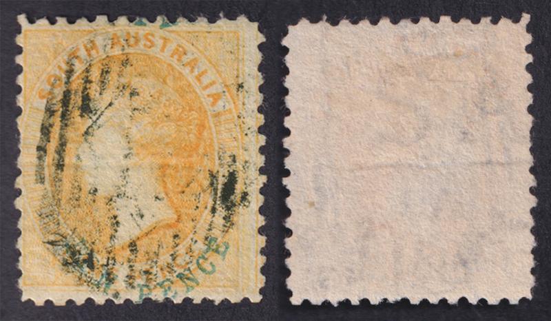 1868 Emergency Issue on Crown/SA Watermark Paper 'TEN PENCE' in Blue on 9d yellow SG 78a with the Watermark Reversed & Misplaced (with 'S' of the sheet-watermartk below), untidy numeral cancel, Cat £2000. Ex 'Dubois' (Part I): sold for SFr605 (possibly because it was described as having a "horizontal ironed crease", that is actually the heavily impressed horizontal watermark line). Harry Lower's, Michael Blake's and Don Pearce's examples sold for $2990 $2445 & $2275 respectively.