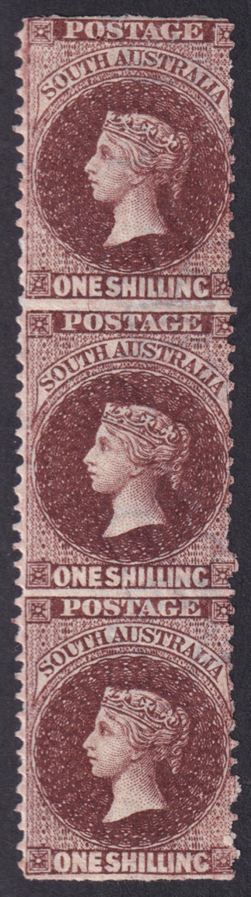 1901-02 Large Crown/SA 1/- dark reddish brown vertical strip of 3 Imperforate Horizontally SG 148a, the upper unit with a minor hinge remainder, the lower pair is unmounted, Cat £4000+ for a mounted pair. Ex 'Dubois' (Part I): sold for SFr1815. (Image1)