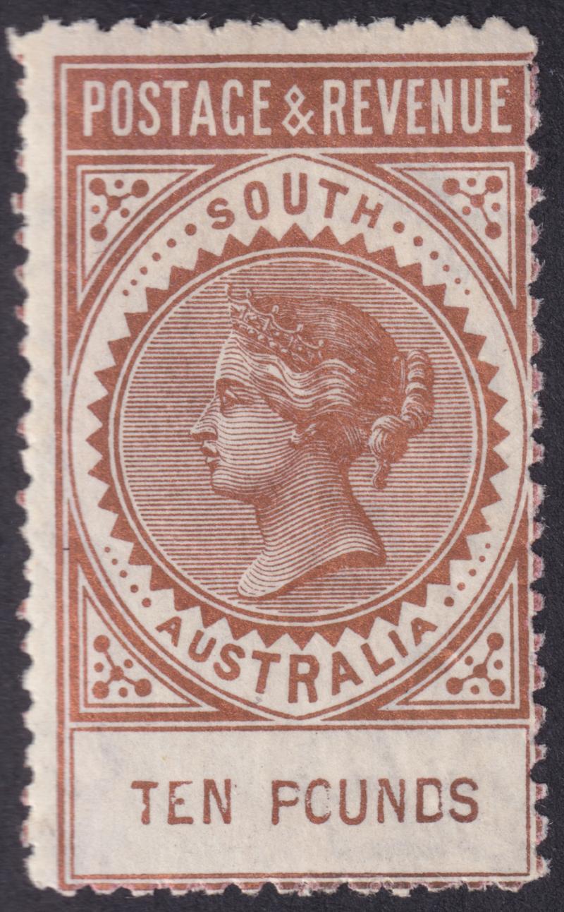 1886-96 'POSTAGE & REVENUE' Perf 11½-12½ £10 bronze SG 206a, a very fresh example from the original printing with strong metallic sheen, lightly mounted, lightly signed "AD" (= Alberto Diena) on the reverse, Cat £9000. An extremely rare stamp: most examples offered are cleaned fiscals, or reprints with patchy gum & the 'SPECIMEN' Overprint removed. Ex 'Dubois' (Part I): sold for SFr2420. BPA Certificate (2002) (Image1)