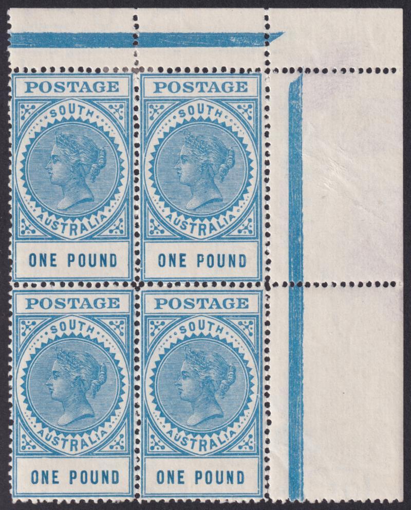 1904-11 De La Rue Tall Stamps with Thick 'POSTAGE' Perf 12 £1 blue ACSC S73 (SG 292) corner block of 4 from the upper-right of the sheet, unusually well-centred, very fresh & lightly mounted (a hinge remainder in the upper margin just impinges on the upper units that are otherwise unmounted) Cat $2400+ (£1600+) for singles. Ex 'Dubois' (Part 4): sold for SFr605. (Image1)