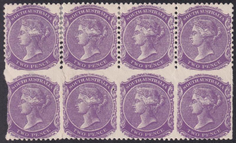 1905-12 Crown/A Small Stamps 2d deep violet block of 8 (4x2) with the lower row Imperf on Three Sides ACSC S9b (SG 295aa), the lower-left unit damaged from having been manually separated & the next unit impacted by a closed tear also from partial manual separation, a couple of minor bends, the right-hand block of 4 very fine with the lower units being unmounted, Cat $6000+ for four vertical pairs (£7000+ for two horizontal pairs). Ex 'Dubois' (Part 4): sold for SFr3415. (Image1)