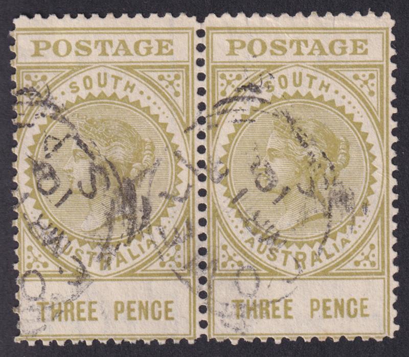 1906-12 Thick 'POSTAGE' Crown/A Tall Stamps 3d olive Perf 11 ACSC S37 (SG 298e) horizontal pair, light 'COWELL/MR11/10/S-A' squared-circle cancels as usual, Cat $3000+ (£1700+) for singles. Ex 'Dubois' (Part 4): sold for SFr427. Don Pearce's better-cancelled pair sold for $1795 (Sale 249 Lot 1411). (Image1)